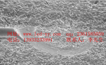 这部分主要是瓷嘴质量问题,使用超过寿命所致;瓷嘴寿命不能以固定“实际打线产量”为准,而是结合焊线效果决定;当不足产量要求时,若已经造成焊线效果不合格(结合高倍率显微镜检验),也应立即更换;另外,人工返工塌线修线不当亦可造成金线刮伤。上图为金线刮痕。